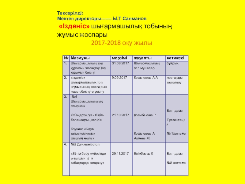 Тексерілді:Мектеп директоры------- Ы.Т Салманов «Ізденіс» шығармашылық тобының жұмыс жоспары