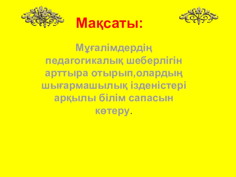 Мақсаты:Мұғалімдердің педагогикалық шеберлігін арттыра отырып,олардың шығармашылық ізденістері арқылы білім сапасын көтеру.