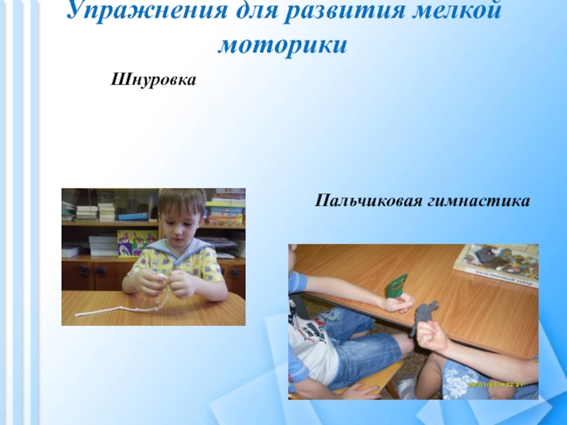 1) «Кулак-ребро-ладонь» - четыре положения руки на плоскости последовательно сменяют друг друга. Выполняется сначала правой рукой, затем левой рукой. Затем двумя руками одновременно.