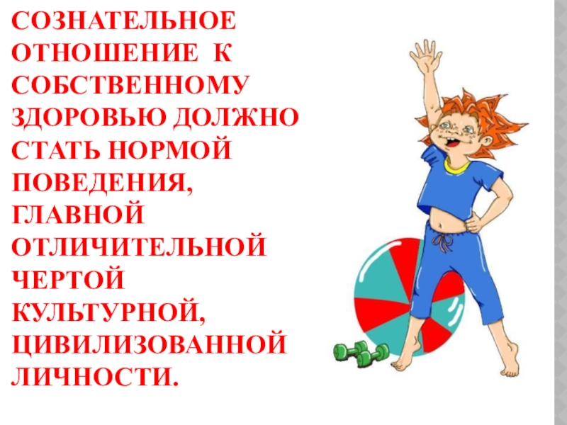 СОЗНАТЕЛЬНОЕ ОТНОШЕНИЕ К СОБСТВЕННОМУ ЗДОРОВЬЮ ДОЛЖНО СТАТЬ НОРМОЙ ПОВЕДЕНИЯ, ГЛАВНОЙ ОТЛИЧИТЕЛЬНОЙ ЧЕРТОЙ КУЛЬТУРНОЙ, ЦИВИЛИЗОВАННОЙ ЛИЧНОСТИ.