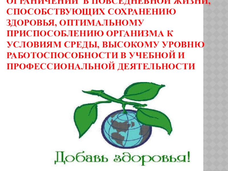 ЗДОРОВЫЙ ОБРАЗ ЖИЗНИ (ЗОЖ) - ЭТО ПРОЦЕСС СОБЛЮДЕНИЯ ЧЕЛОВЕКОМ ОПРЕДЕЛЁННЫХ НОРМ, ПРАВИЛ И ОГРАНИЧЕНИЙ В ПОВСЕДНЕВНОЙ ЖИЗНИ, СПОСОБСТВУЮЩИХ СОХРАНЕНИЮ ЗДОРОВЬЯ, ОПТИМАЛЬНОМУ ПРИСПОСОБЛЕНИЮ ОРГАНИЗМА К УСЛОВИЯМ СРЕДЫ, ВЫСОКОМУ УРОВНЮ РАБОТОСПОСОБНОСТИ В УЧЕБНОЙ И ПРОФЕССИОНАЛЬНОЙ ДЕЯТЕЛЬНОСТИ