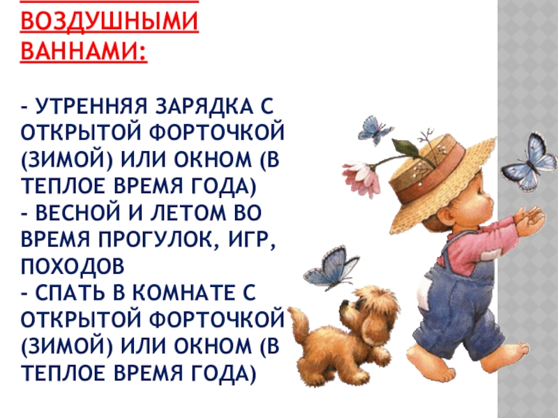 Слайд 13СПОСОБЫ ЗАКАЛИВАНИЯ ВОЗДУШНЫМИ ВАННАМИ: - УТРЕННЯЯ ЗАРЯДКА С ОТКРЫТОЙ ФОРТОЧКОЙ (ЗИМОЙ) ИЛИ
