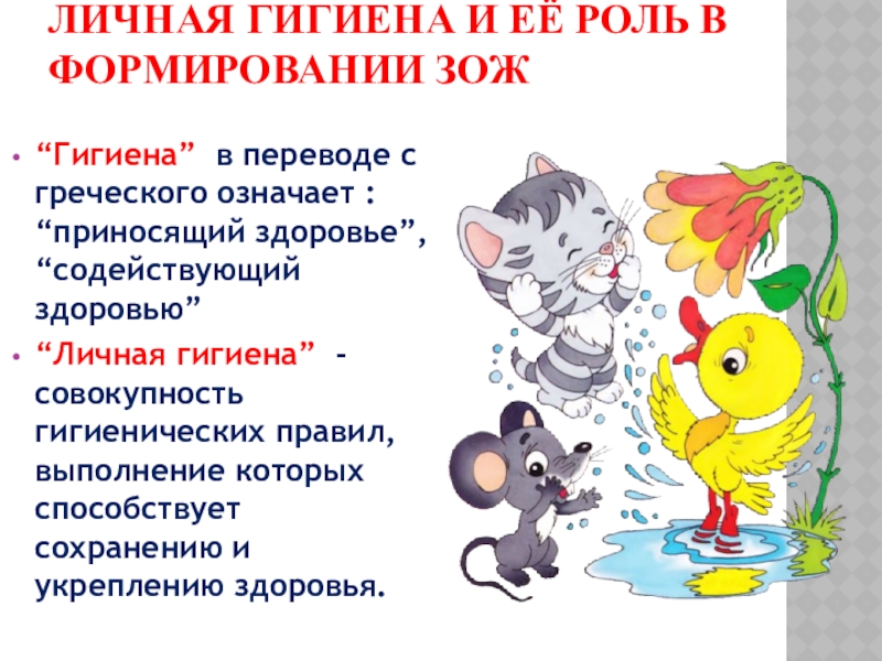 ЛИЧНАЯ ГИГИЕНА И ЕЁ РОЛЬ В ФОРМИРОВАНИИ ЗОЖ “Гигиена” в переводе с греческого означает : “приносящий здоровье”,