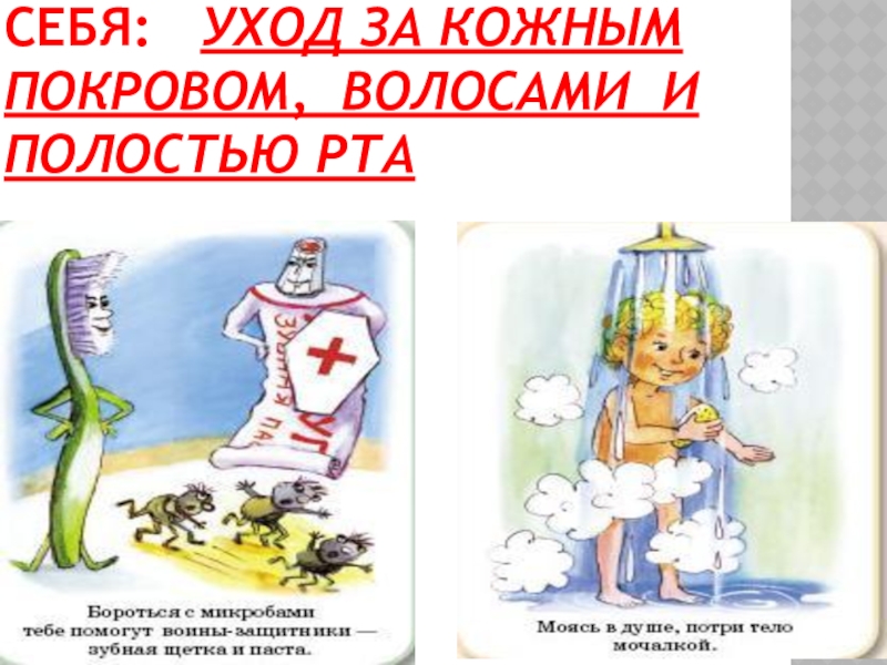 УХОД ЗА ТЕЛОМ ВКЛЮЧАЕТ В СЕБЯ:  УХОД ЗА КОЖНЫМ ПОКРОВОМ, ВОЛОСАМИ И ПОЛОСТЬЮ РТА
