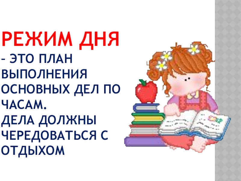 Слайд 16РЕЖИМ ДНЯ – ЭТО ПЛАН ВЫПОЛНЕНИЯ ОСНОВНЫХ ДЕЛ ПО ЧАСАМ. ДЕЛА ДОЛЖНЫ
