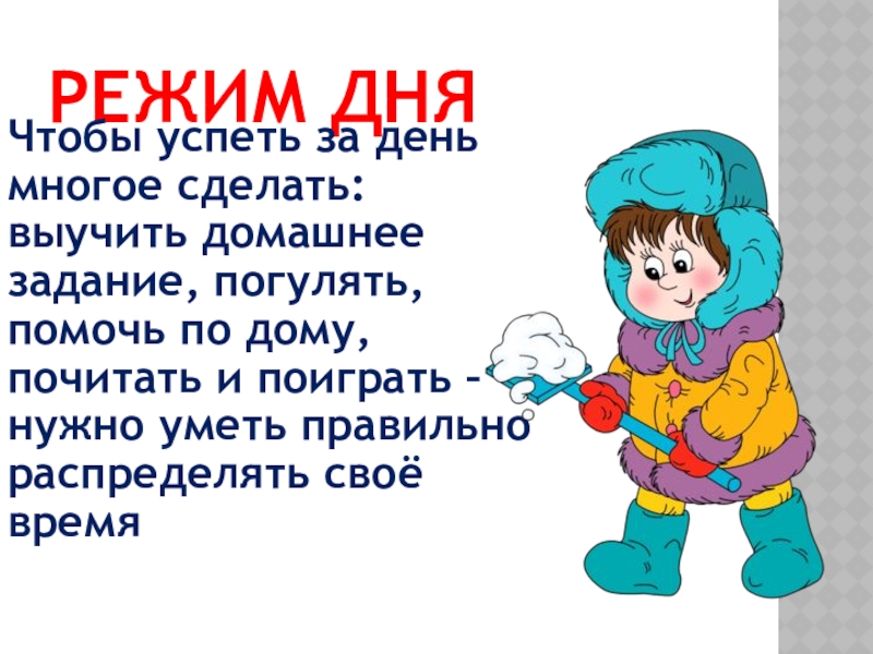 РЕЖИМ ДНЯ  Чтобы успеть за день многое сделать: выучить домашнее задание, погулять, помочь по дому, почитать