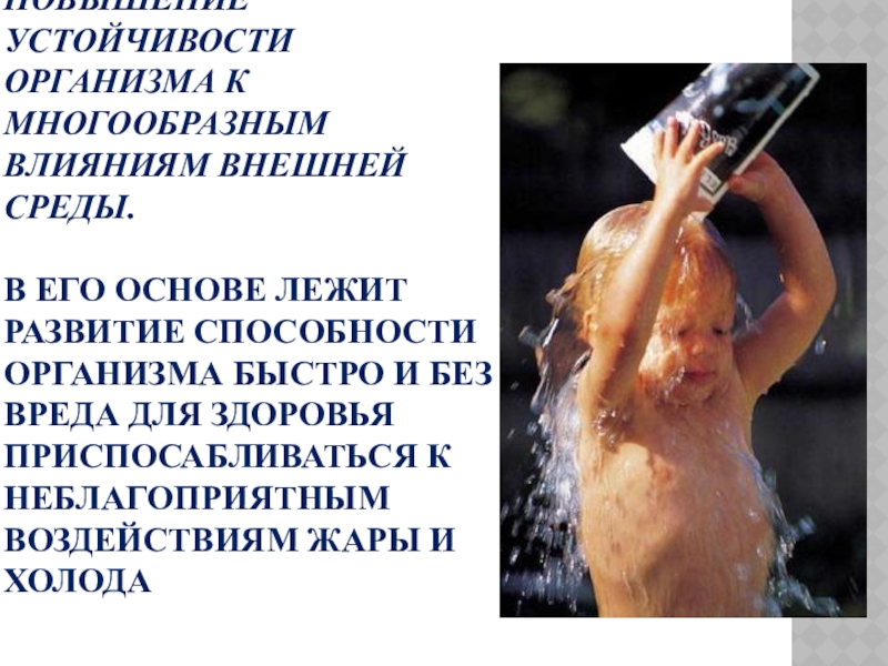 МНОГООБРАЗНЫМ ВЛИЯНИЯМ ВНЕШНЕЙ СРЕДЫ. В ЕГО ОСНОВЕ ЛЕЖИТ РАЗВИТИЕ СПОСОБНОСТИ ОРГАНИЗМА БЫСТРО И БЕЗ ВРЕДА ДЛЯ ЗДОРОВЬЯ ПРИСПОСАБЛИВАТЬСЯ К НЕБЛАГОПРИЯТНЫМ ВОЗДЕЙСТВИЯМ ЖАРЫ И ХОЛОДА