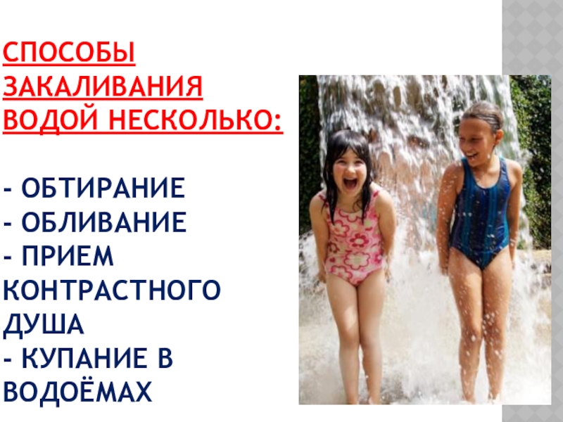 Слайд 12СПОСОБЫ ЗАКАЛИВАНИЯ ВОДОЙ НЕСКОЛЬКО: - ОБТИРАНИЕ - ОБЛИВАНИЕ - ПРИЕМ КОНТРАСТНОГО ДУША -