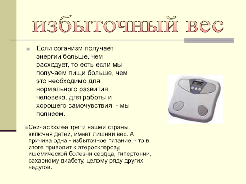 Сейчас более трети нашей страны, включая детей, имеет лишний вес. А причина одна - избыточное питание, что в итоге приводит к атеросклерозу, ишемической болезни сердца, гипертонии, сахарному диабету, целому ряду других недугов.