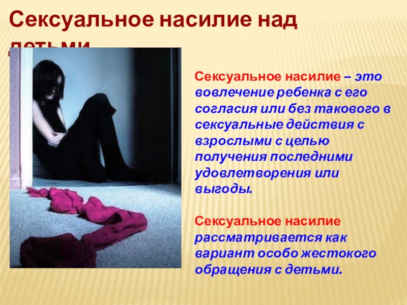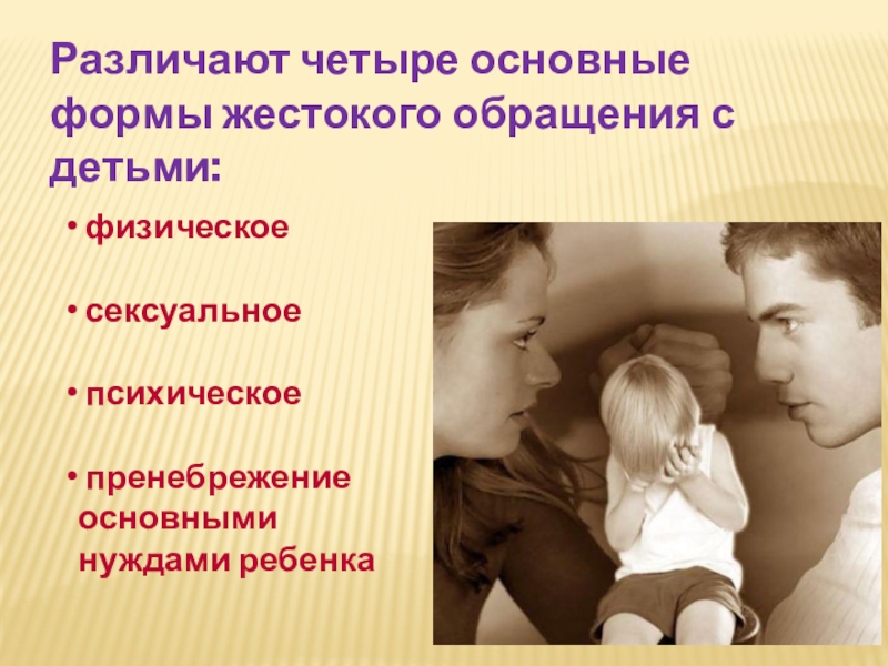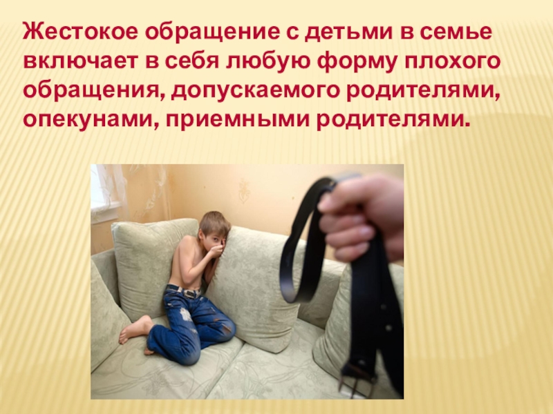 Слайд 10Жестокое обращение с детьми в семье включает в себя любую форму