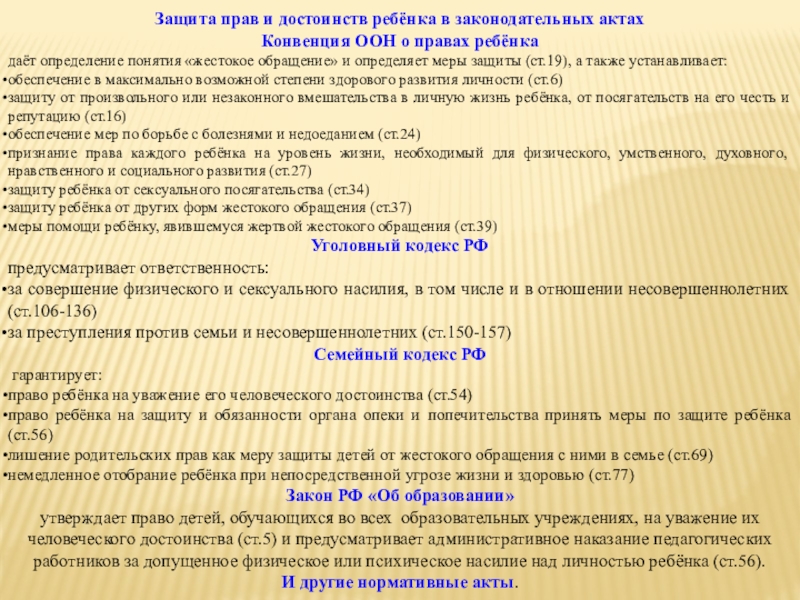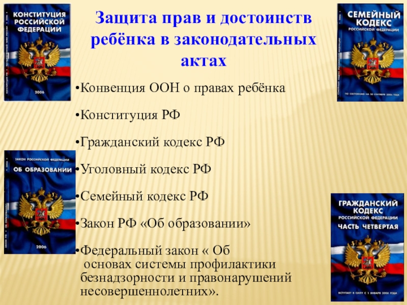 Слайд 29Защита прав и достоинств ребёнка в законодательных актах