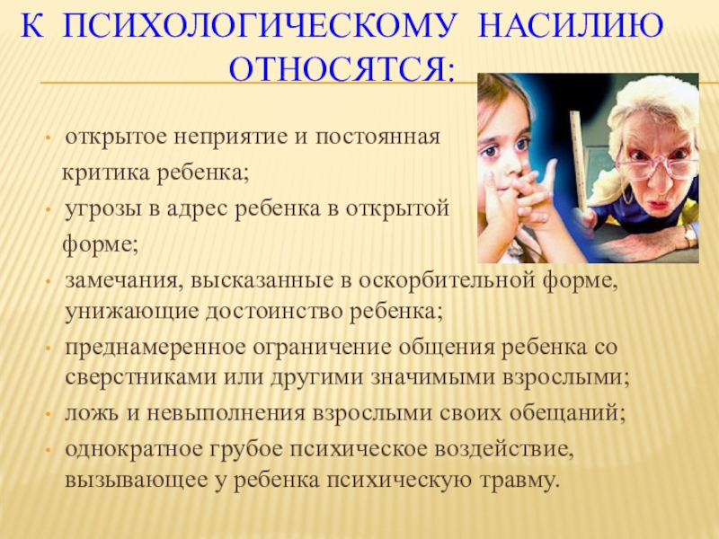 Слайд 16К психологическому насилию относятся: