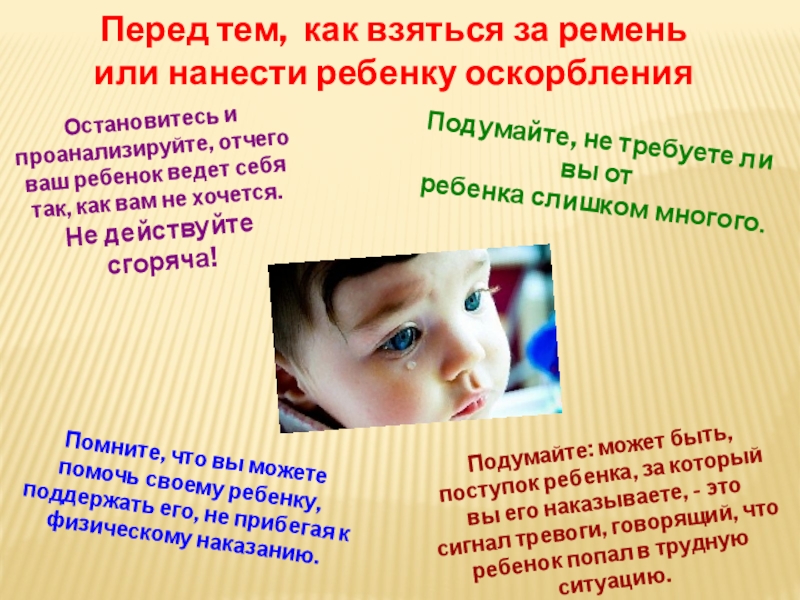 Подумайте: может быть, поступок ребенка, за который вы его наказываете, - это сигнал тревоги, говорящий, что ребенок попал в трудную ситуацию.