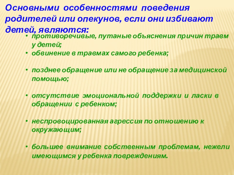 Основными особенностями поведения родителей или опекунов, если они избивают детей, являются: