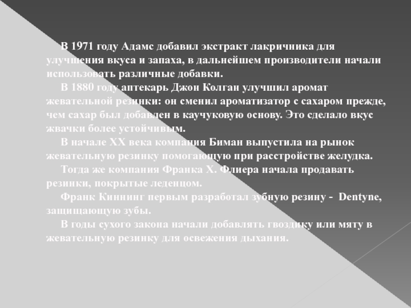 Слайд 9 В 1971 году Адамс добавил экстракт лакричника для