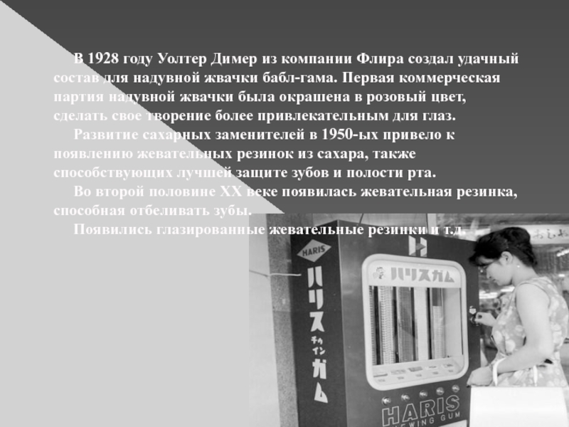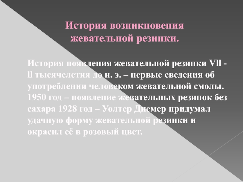 История появления жевательной резинки Vll - ll тысячелетия до н. э. – первые сведения об употреблении человеком жевательной смолы. 1950 год – появление жевательных резинок без сахара 1928 год – Уолтер Диемер придумал удачную форму жевательной резинки и окрасил её в розовый цвет.