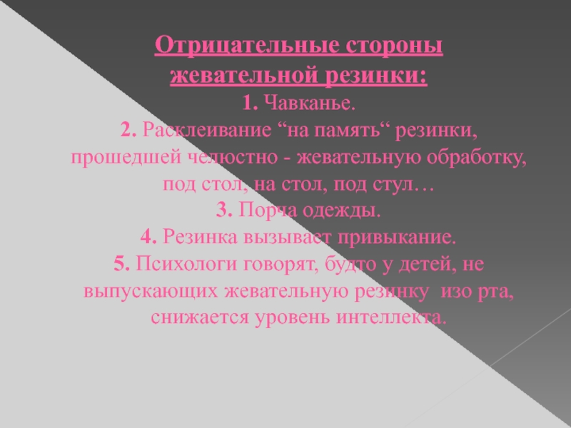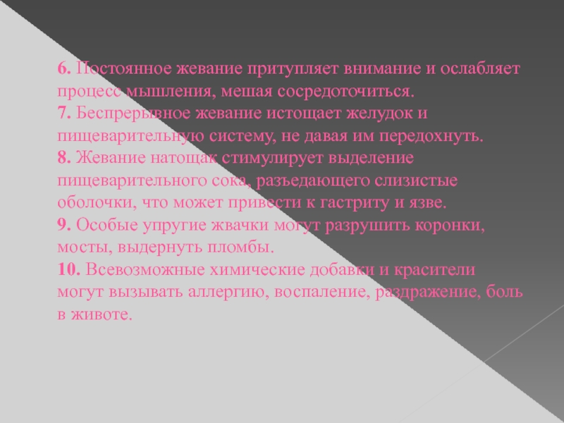 Слайд 216. Постоянное жевание притупляет внимание и ослабляет процесс мышления, мешая сосредоточиться.
