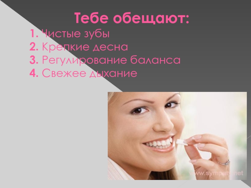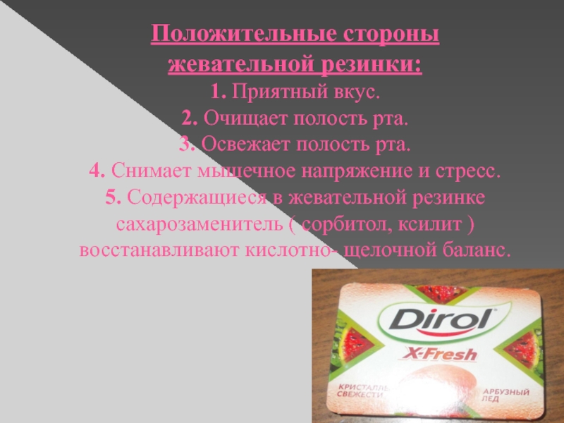 5. Содержащиеся в жевательной резинке сахарозаменитель ( сорбитол, ксилит ) восстанавливают кислотно- щелочной баланс.