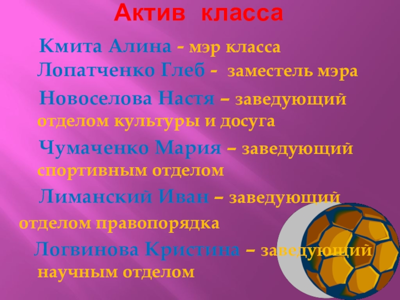 Актив класса   Кмита Алина - мэр класса       Лопатченко Глеб