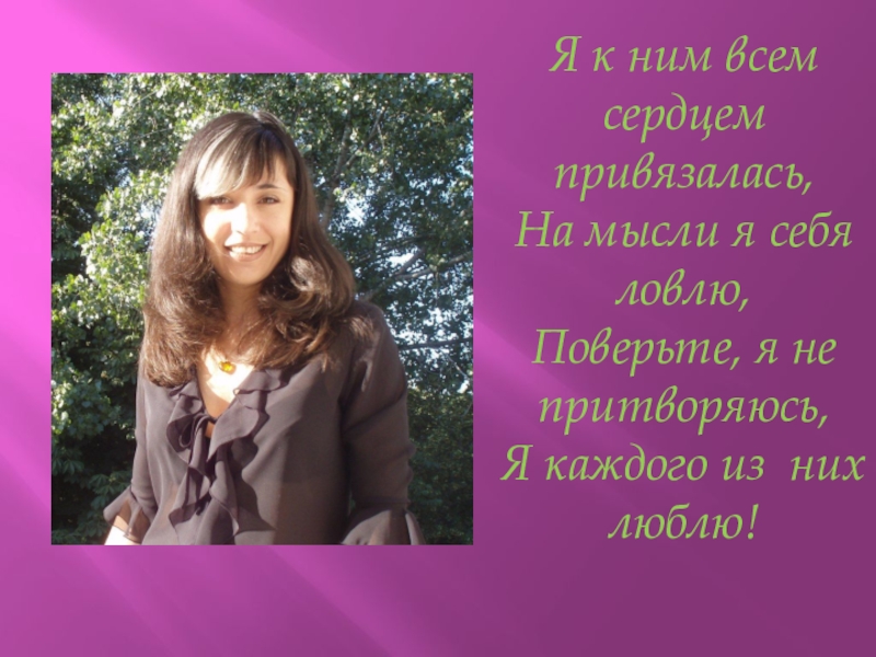 Я к ним всем сердцем привязалась,На мысли я себя ловлю,Поверьте, я не притворяюсь, Я каждого из них