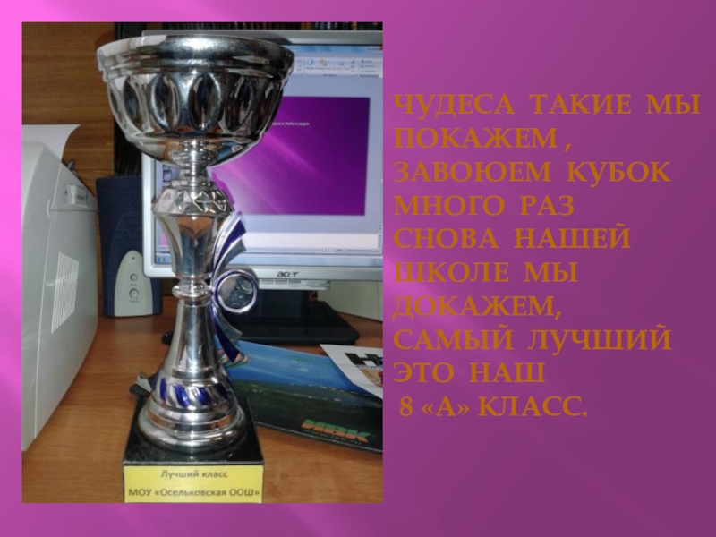 Чудеса такие мы покажем ,Завоюем кубок много разСнова нашей школе мы докажем, Самый лучший это наш 8