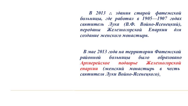 в 1905—1907 годах святитель Лука (В.Ф. Войно-Ясенецкий), переданы Железногорской Епархии для создание женского монастыря.