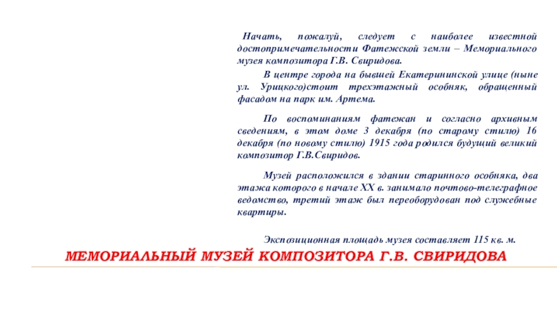 достопримечательности Фатежской земли – Мемориального музея композитора Г.В. Свиридова.