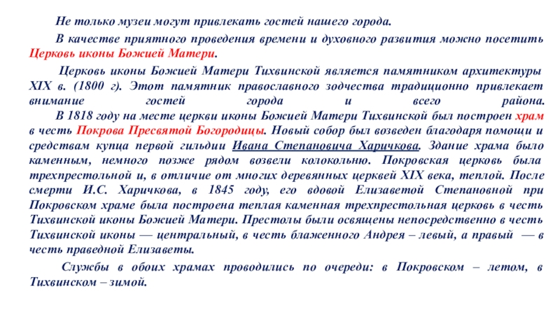 Церковь иконы Божией Матери Тихвинской является памятником архитектуры XIX в. (1800 г). Этот памятник православного зодчества традиционно привлекает внимание гостей города и всего района.