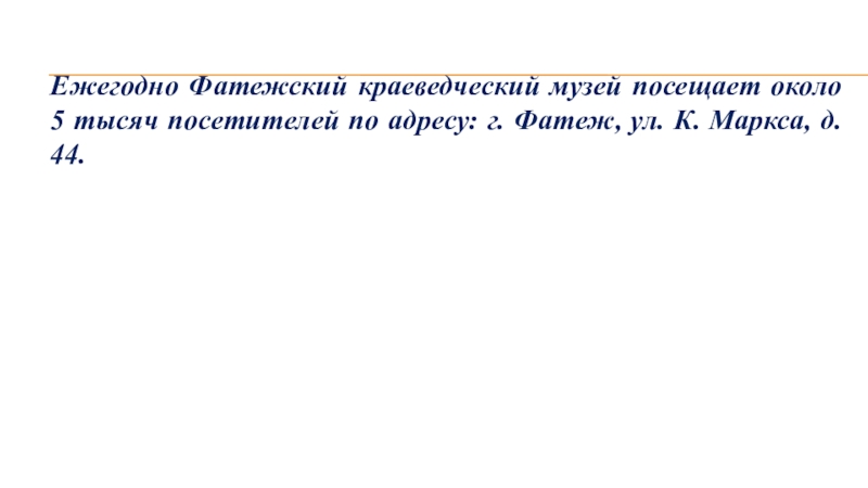 Слайд 13Ежегодно Фатежский краеведческий музей посещает около 5 тысяч посетителей по адресу: