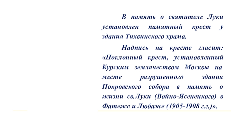 Надпись на кресте гласит: «Поклонный крест, установленный Курским землячеством Москвы на месте разрушенного здания Покровского собора в память о жизни св.Луки (Войно-Ясенецкого) в Фатеже и Любаже (1905-1908 г.г.)».