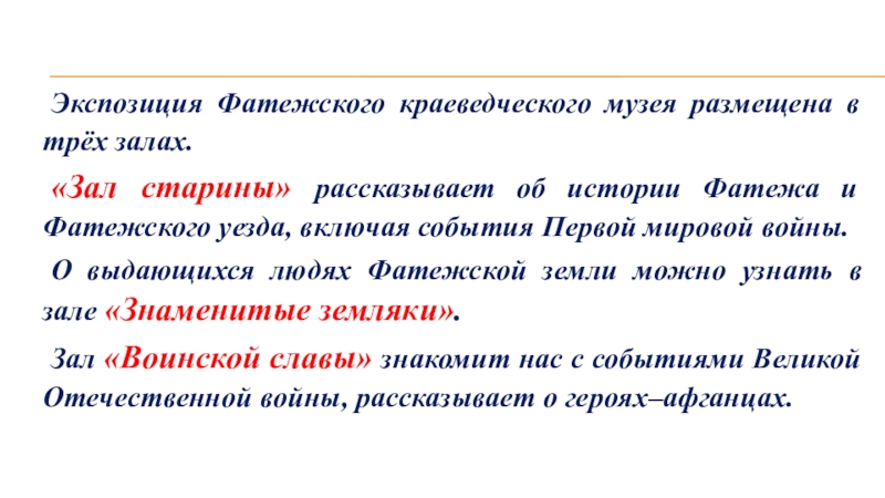 Слайд 11 Экспозиция Фатежского краеведческого музея размещена в трёх залах.