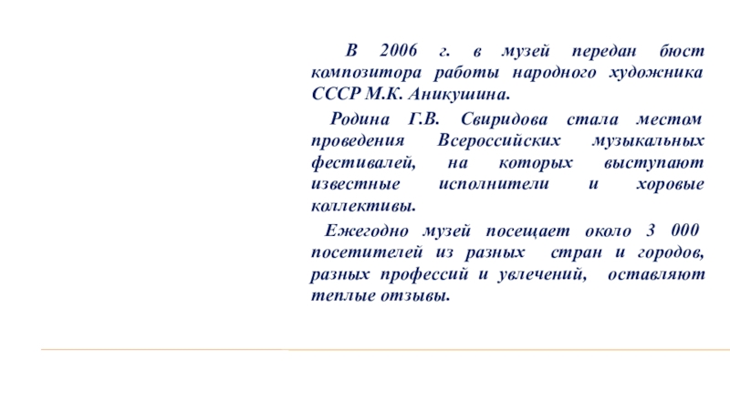 Слайд 8 В 2006 г. в музей передан бюст композитора работы народного
