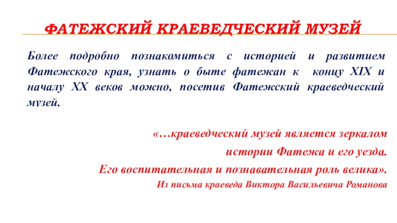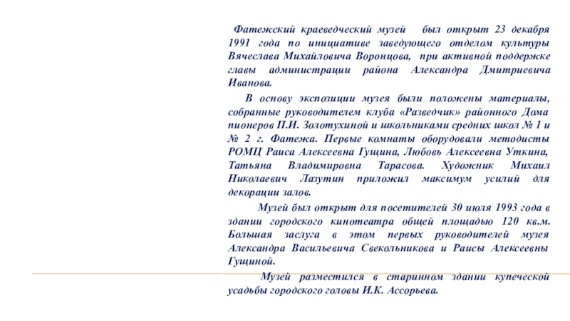 Слайд 10 Фатежский краеведческий музей был открыт 23 декабря 1991