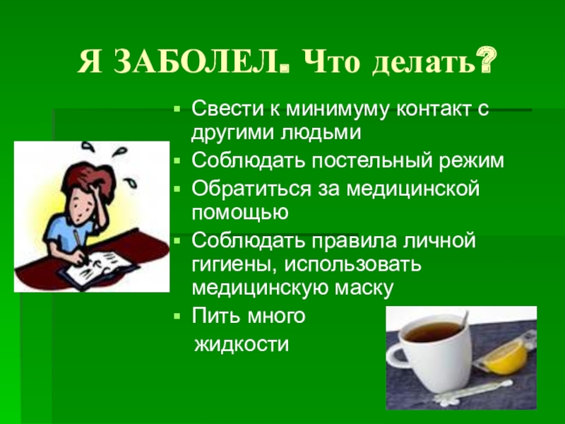 Я ЗАБОЛЕЛ. Что делать?Свести к минимуму контакт с другими людьмиСоблюдать постельный режимОбратиться за медицинской помощьюСоблюдать правила личной