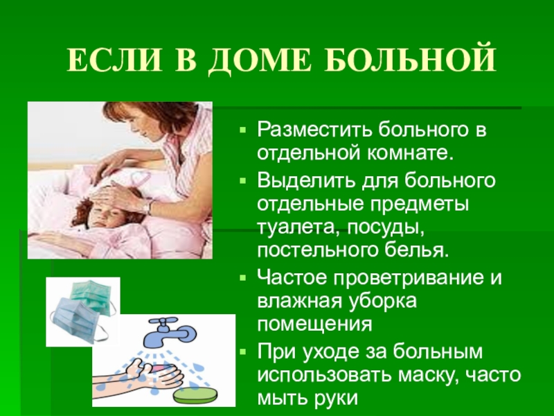 ЕСЛИ В ДОМЕ БОЛЬНОЙРазместить больного в отдельной комнате.Выделить для больного отдельные предметы туалета, посуды, постельного белья.Частое проветривание