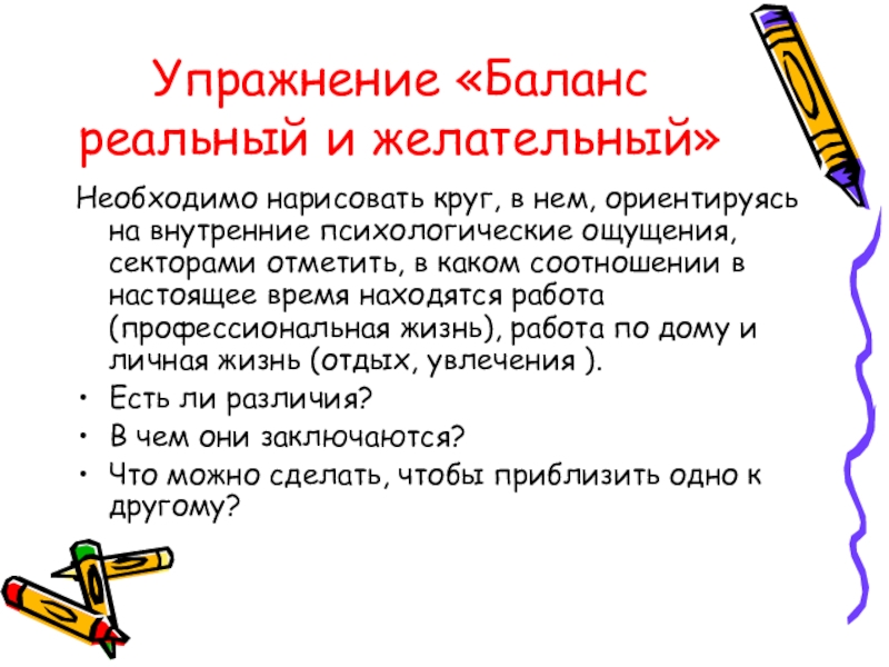 Слайд 21Упражнение «Баланс реальный и желательный»