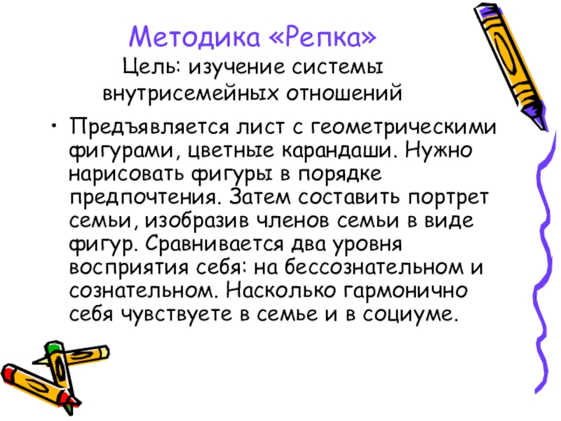 карандаши. Нужно нарисовать фигуры в порядке предпочтения. Затем составить портрет семьи, изобразив членов семьи в виде фигур. Сравнивается два уровня восприятия себя: на бессознательном и сознательном. Насколько гармонично себя чувствуете в семье и в социуме.