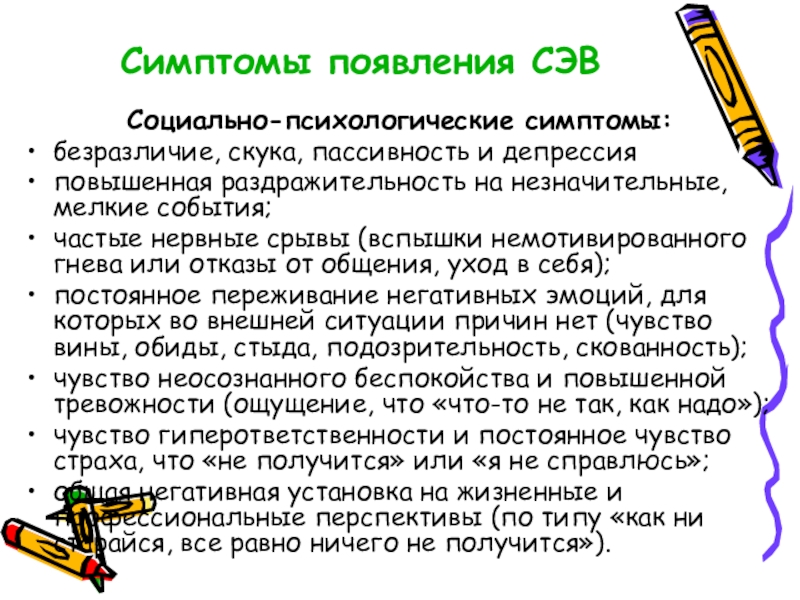 постоянное переживание негативных эмоций, для которых во внешней ситуации причин нет (чувство вины, обиды, стыда, подозрительность, скованность);