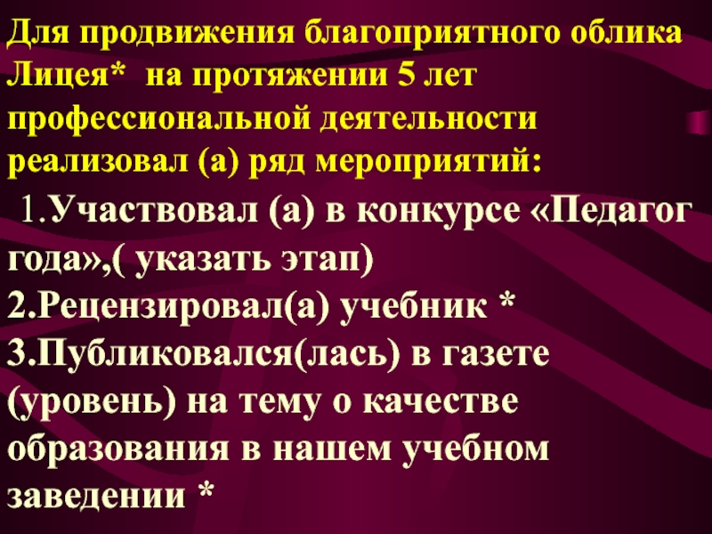 Для продвижения благоприятного облика Лицея* на протяжении 5 лет профессиональной деятельности
