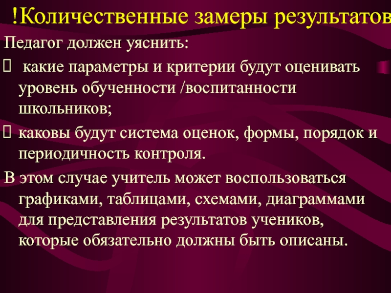 В этом случае учитель может воспользоваться графиками, таблицами, схемами, диаграммами для представления результатов учеников, которые обязательно должны быть описаны.