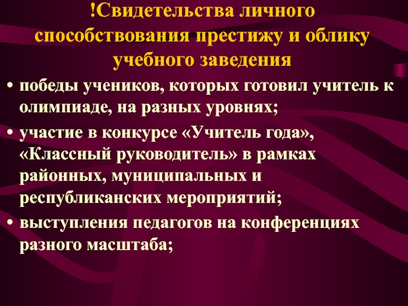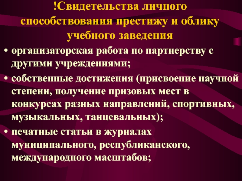 Слайд 53!Свидетельства личного способствования престижу и облику учебного заведения
