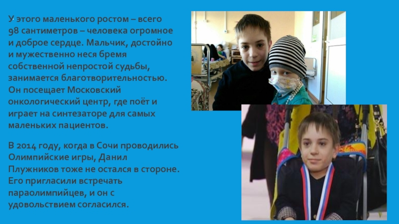 огромное и доброе сердце. Мальчик, достойно и мужественно неся бремя собственной непростой судьбы, занимается благотворительностью. Он посещает Московский онкологический центр, где поёт и играет на синтезаторе для самых маленьких пациентов.