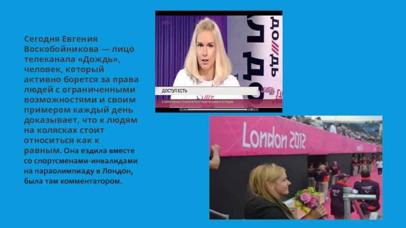 Слайд 13Сегодня Евгения Воскобойникова — лицо телеканала «Дождь», человек, который активно борется