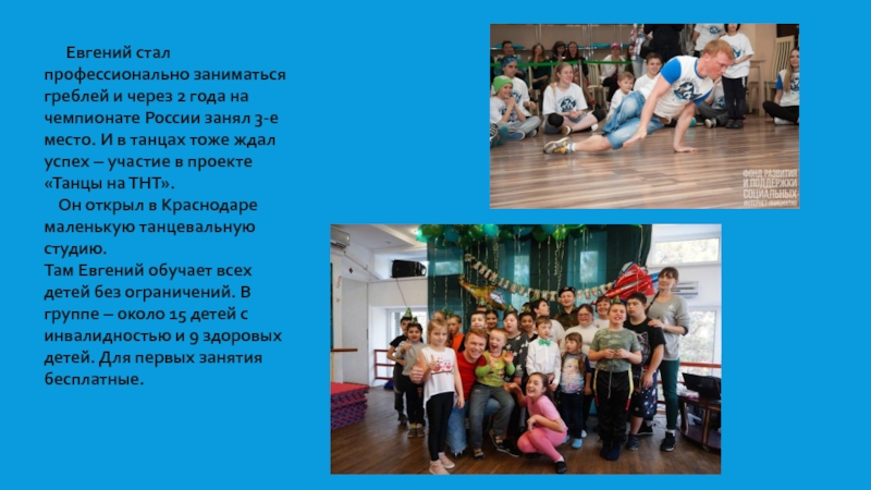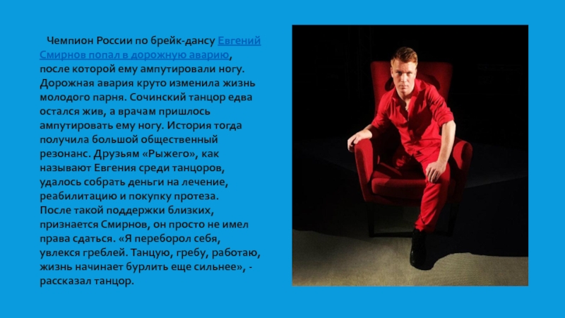 Слайд 5 Чемпион России по брейк-дансу Евгений Смирнов попал в дорожную