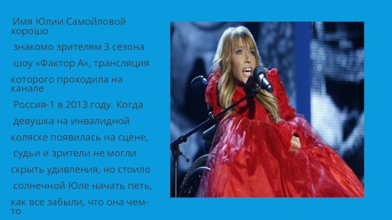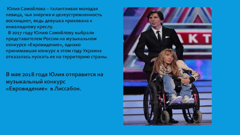 Слайд 18 Юлия Самойлова – талантливая молодая певица, чья энергия и целеустремленность