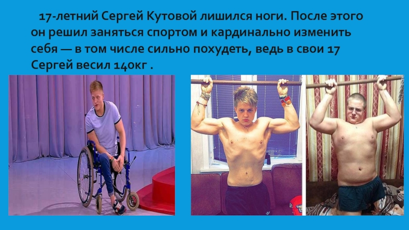 Слайд 15 17-летний Сергей Кутовой лишился ноги. После этого он решил