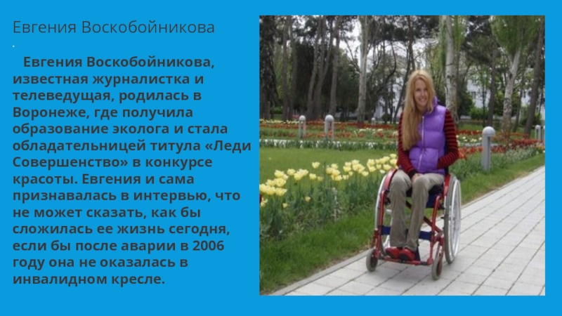 в Воронеже, где получила образование эколога и стала обладательницей титула «Леди Совершенство» в конкурсе красоты. Евгения и сама признавалась в интервью, что не может сказать, как бы сложилась ее жизнь сегодня, если бы после аварии в 2006 году она не оказалась в инвалидном кресле.