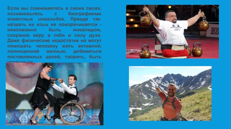 Слайд 4Если вы сомневаетесь в своих силах, познакомьтесь с биографиями известных инвалидов.