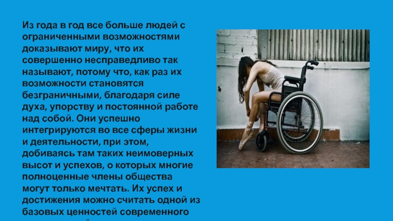 миру, что их совершенно несправедливо так называют, потому что, как раз их возможности становятся безграничными, благодаря силе духа, упорству и постоянной работе над собой. Они успешно интегрируются во все сферы жизни и деятельности, при этом, добиваясь там таких неимоверных высот и успехов, о которых многие полноценные члены общества могут только мечтать. Их успех и достижения можно считать одной из базовых ценностей современного мира, которой, несомненно, стоит гордиться.