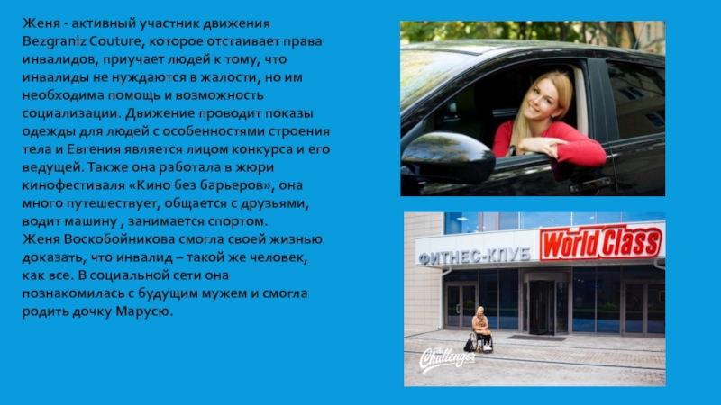 Слайд 14Женя - активный участник движения Bezgraniz Couture, которое отстаивает права инвалидов,